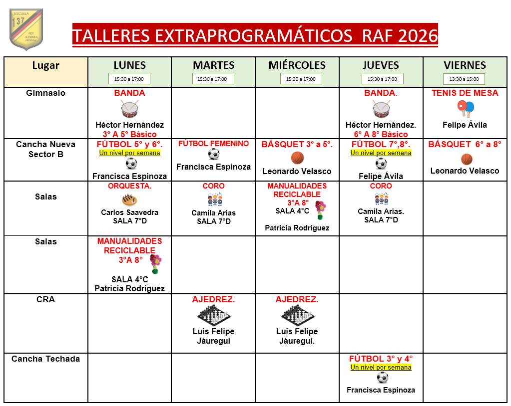 Horarios Talleres 2026 AdminRAF 09/Abril/202609/Abril/2026 Ante cualquier duda, comunicarse con el profesor Isaac Ortiz al siguiente correo isaac.ortiz@escuelaraf.cl